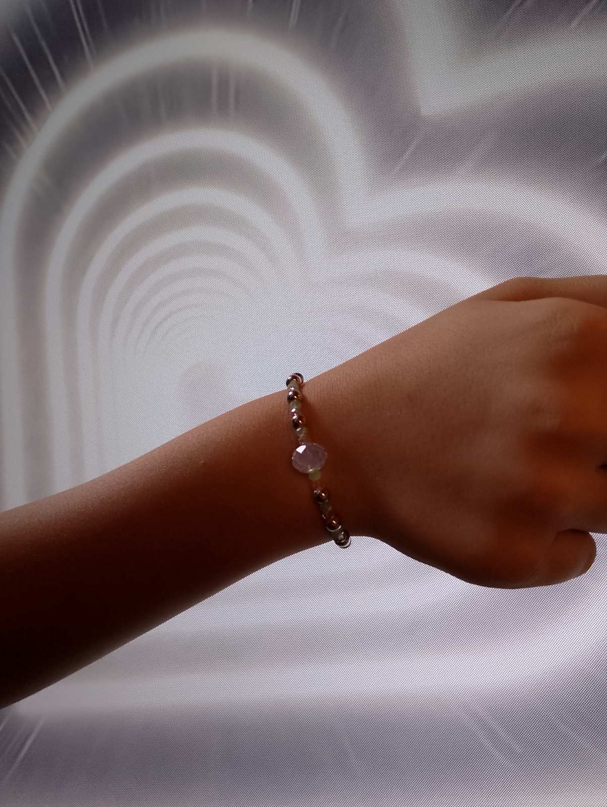 Ръчно изработена гривна от бели и сребристи мъниста, украсена с пластмасова перла.